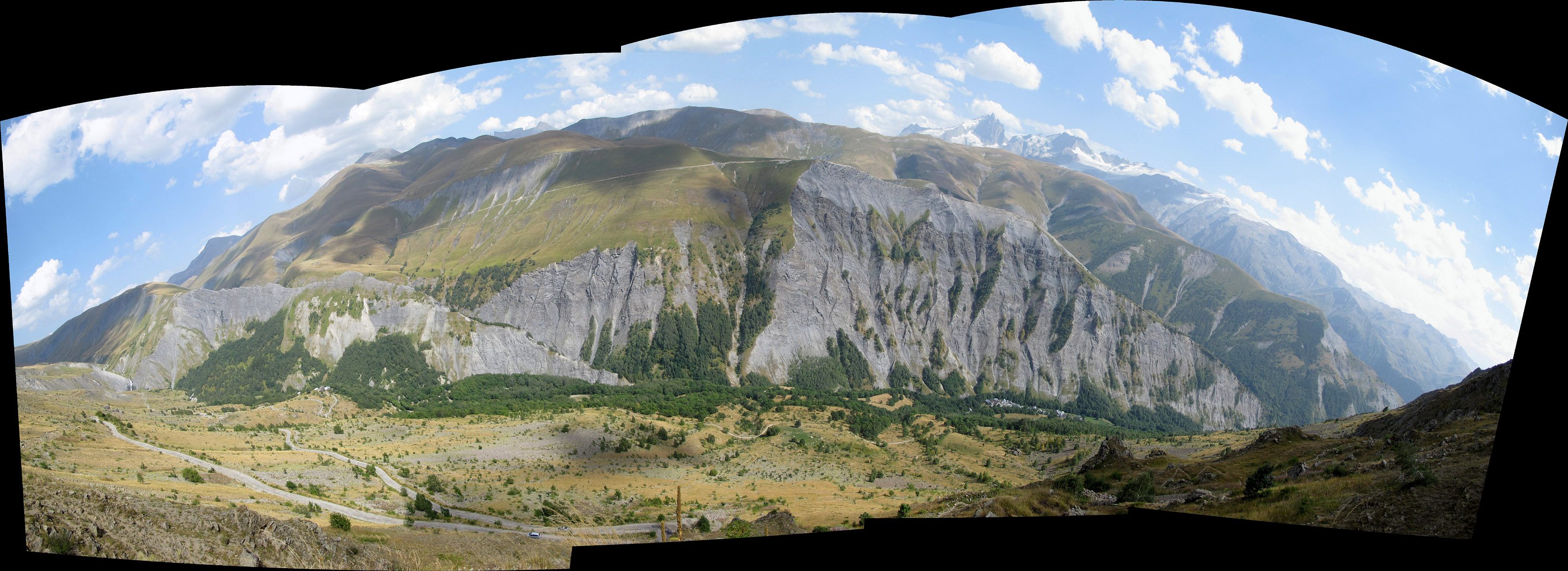 Blick vom oberen Teil der Ostrampe hinunter in den mittleren. Rechts unten ist der Ort Besse zu erkennen. In der Mitte des vorderen Berges, ziemlich weit oben, sind zwei Einschnitte zu sehen, die vom Zentrum nach links verlaufen. Der obere, etwas schwächer zu Erkennende gehört zur Runde um das Plateau d'Emparis(i), die auf schönst geschottertem Weg erfahren werden kann.