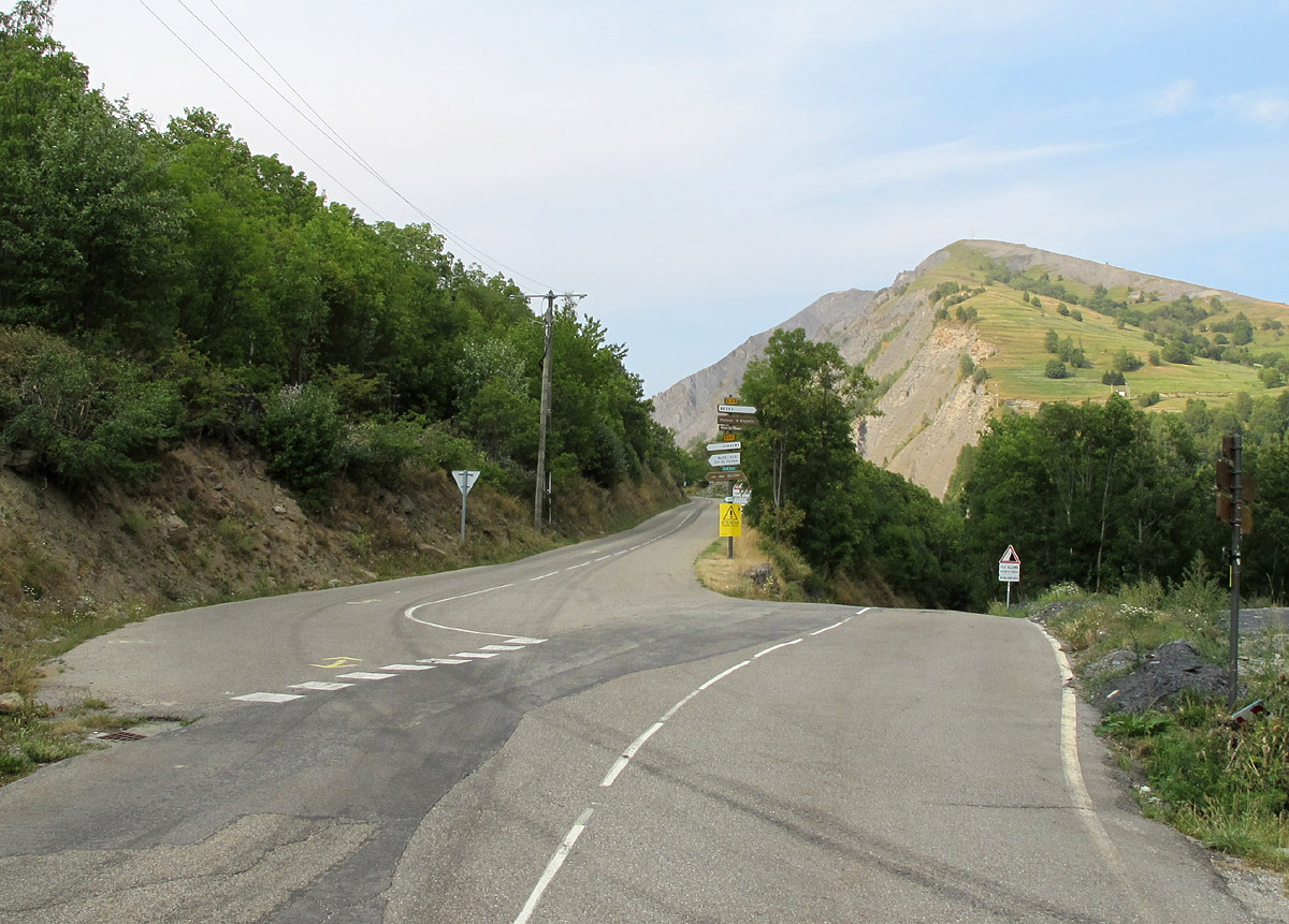 Die "entscheidende" Kreuzung auf der Ostrampe des Sarenne, hier von unten fotografiert. Links geht es hoch zum Sarenne, rechts nach Besse und später auf geschottertem Pfad zum Plateau d'Emparis(i).