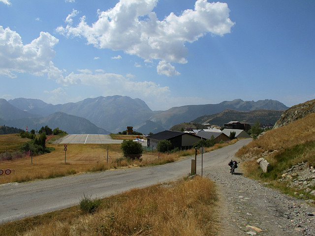 In Verlängerung zur Landebahn befindet sich ein gesperrter Schotterweg, der den Blick von oben auf das Geschehen erlaubt. Wer genau hinschaut, links neben der Bahn stehen ein paar Bäume. Über den höchsten davon ist ein Bergeinschnitt zu erkennen, genau dort liegt die Passhöhe des Col de Solude.