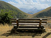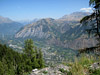 In der Mitte des vorderen Berges, ziemlich weit oben, sind zwei Einschnitte zu sehen, die vom Zentrum nach links verlaufen. Der obere, etwas schwächer zu Erkennende gehört zur Runde um das Plateau d'Emparis(i), dessen höchste Stelle andeutungsweise mit im Bild ist. Diese einfach geschotterte Strecke könnte gleich im Anschluß genommen werden und ist sehr zu empfehlen. Mit im Bild ist auch der Ort Besse, hinter dem die asphaltierte Anfahrt des Emparis endet.