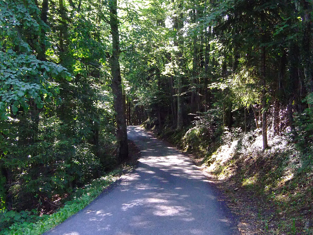 Auf schmalem Sträßchen geht es durch dichten Wald.
