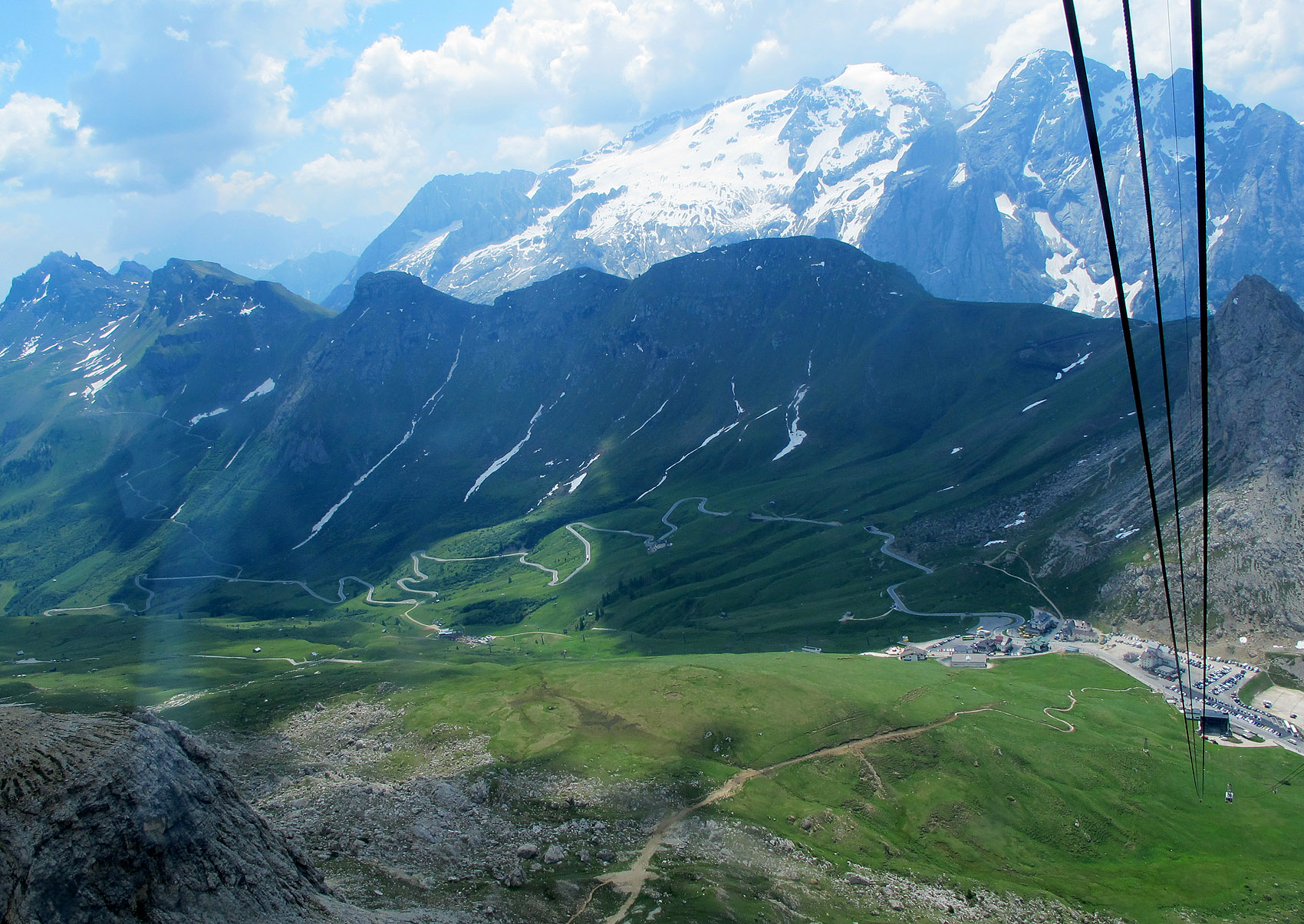Ein Teil der Pordoi-Passhöhe und fast die Hälfte der Kehren der Ostrampe, fotografiert aus der hinauf zum Sass Pordoi fahrenden Gondel, aufgenommen auf halber Höhe.