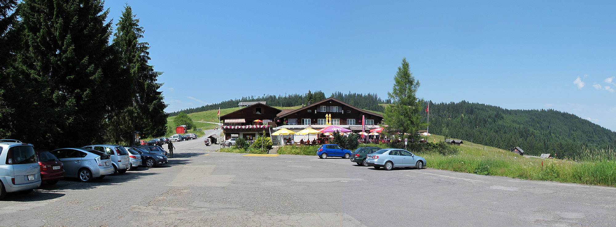 Blick auf das Restaurant auf der Passhöhe, aufgenommen vom Parkplatz aus.
