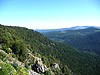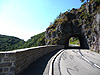 So richtig aus dem Wald heraus kommt man erst wenige Kilometer vor der Passhöhe. Kurz davor taucht eine Felsdurchfahrt auf, vor der ein kleiner Aussichtspunkt errichtet wurde. Von diesem aus kann ein schöner Blick in die Schlucht geworfen werden. Riesig ist die vorhandene Parkfläche nicht, aber ein paar Motorräder passen dort schon hin, und neben der Straße ist noch ein wenig Platz für kurzzeitig haltende Autos.