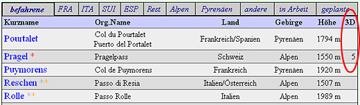 Pässe-Liste die Berichte markiert, zu denen welche angeboten werden. Rechts in der Liste gibt es eine kleine Spalte, in der die Anzahl der 3D-Fotos angezeigt wird.