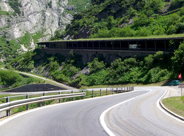 Breite, gut ausgebaute Straße, und eine lange Galerie mit grasbewachsenem Dach.