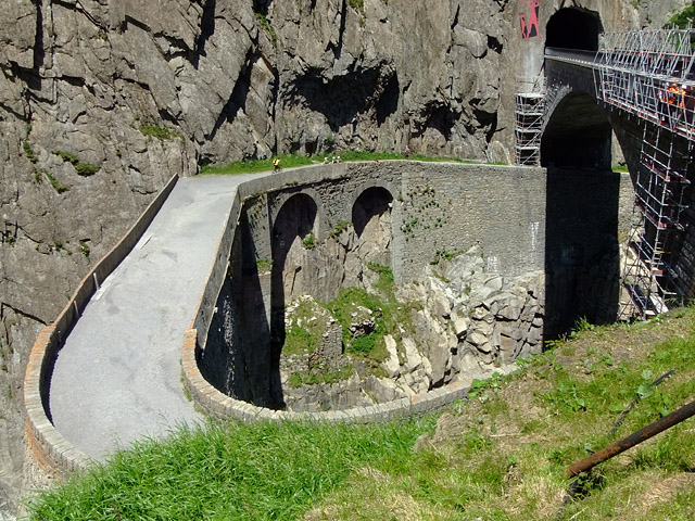 Blick auf die zweite Teufelsbrücke, die zu Fuß erkundet werden kann. Der Tunnel rechts wird auf der neuesten Version erreicht, von der ganz alten, schon um 18 hundert zerstörten Brücke sind links neben dem senkrecht verlaufenden Schatten nur noch die Fundamente der Pfeiler erkennbar.