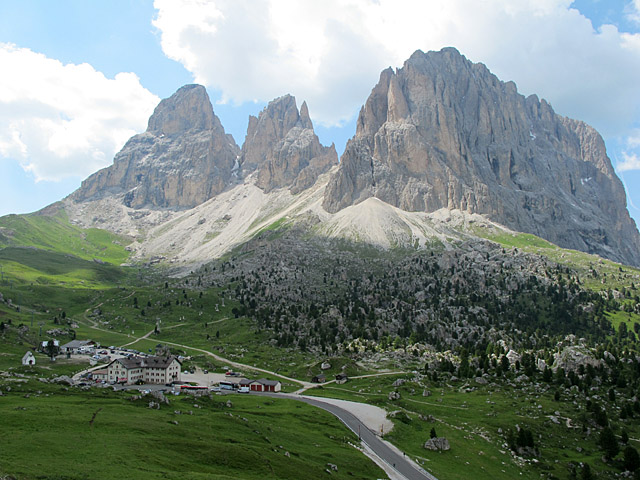 Links unten ist das Rifugio Passo Sella zu sehen, das sich auf der Nordrampe nur wenige Höhenmeter von der Passhöhe entfernt befindet. Im Hintergrund erhebt sich das Felsmassiv der Langkofelgruppe.