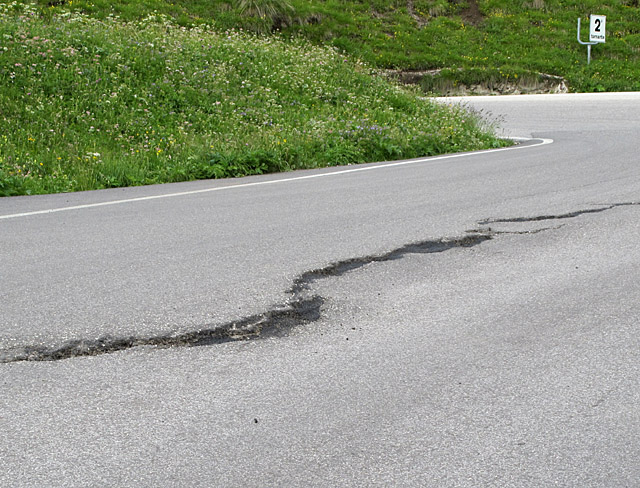 wie diesen, an dem ein breiter und 10-20 Zentimeter hoher Riss durch die Straße geht.
