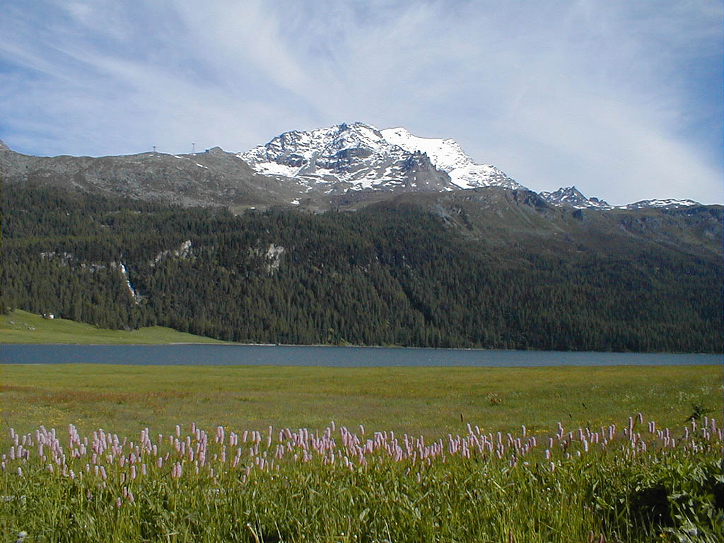 Der kleine Hügel im Hintergrund ist der 3451 Meter hohe Piz Corvatsch. Von Surlej aus, liegt ein paar Meter östlich von Silvaplana, kommt man per Seilbahn bis auf 3300 Meter in die Höhe.