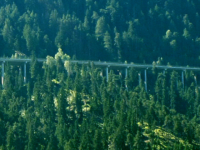 Ein Teil des unteren Drittels der Nordrampe wird auf einer sehr langen Hochbrücke gefahren. Ist man auf ihr unterwegs, fällt das kaum auf, erst der Anblick von unten klärt über diesen Umstand auf.