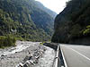 In diesem windet sich die Straße anfangs noch auf Flußhöhe durch die senkrechten Schluchtwände, die mehrere hundert Meter in die Höhe ragen. Wer genau hinschaut, entdeckt in den Felswänden kleine Bäume, die gut als Größenvergleich dienen und gleichzeitig die Frage aufwerfen, wie sich auf solchem Untergrund große Pflanzen festbeißen konnten.