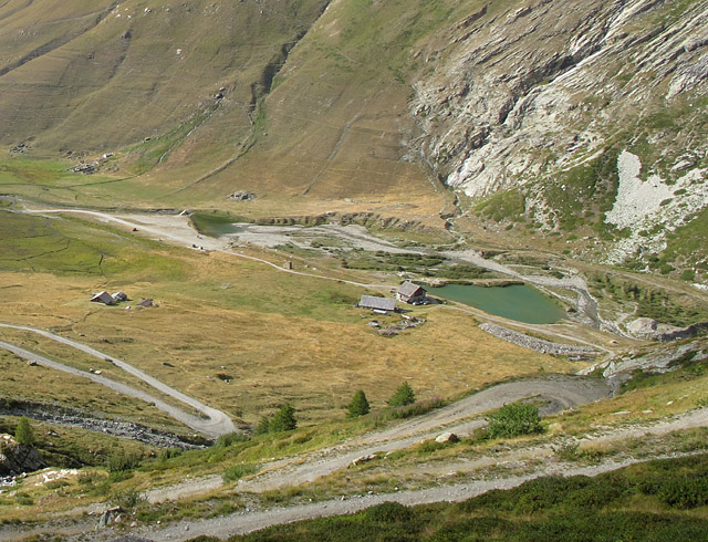 Das Rifugio Scarfiotti mitsamt See und Parkplatz, aufgenommen aus den schweren Kehren heraus.