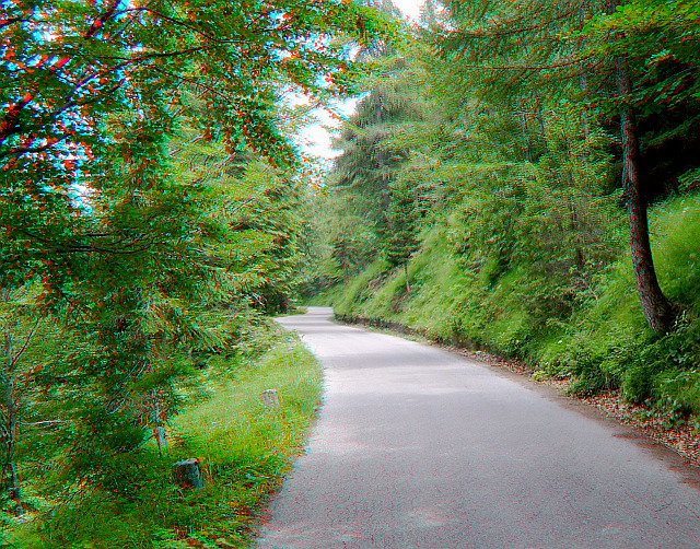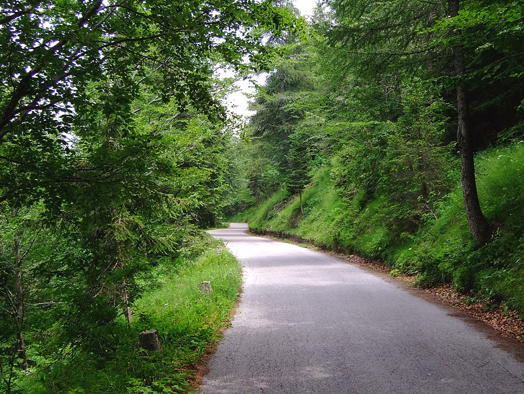 Zwischen dem Rifugio Rosa Baremone und der Passhöhe des Passo della Spina geht die Fahrt für ein paar Kilometer ohne merkliche Steigungen und ohne Kehren durch den Wald. Egal in welcher Richtung man unterwegs ist, in beiden wird es hochinteressant.