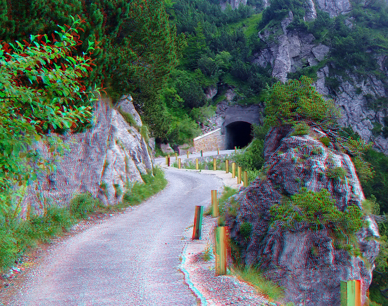 Blick auf die westliche Ausfahrt des letzten Tunnels. In diesem Bereich besteht die Straße aus altem Asphalt, ist aber von einer Schotterschicht überzogen. Charakteristisch für diesen Teil des Passo della Spina sind die Stahlträger, die als Straßenbefestigung dienen sollen. Rechts der Piste geht es steil den Berg hinunter.