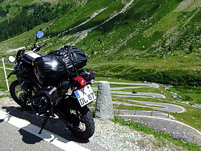 Links meine vollbepackte XT, rechts die netten Kehren aus dem oberen Bereich der Nordrampe. Aufgenommen während meines Trentino-Urlaubes im Jahr 2010. Da ich die ganze Zeit aufpassen musste, das mich niemand über den Haufen fährt (die Stelle ist verkehrstechnisch nicht gut für eine Fotopause geeignet), ist das Bild leider etwas unscharf geworden.