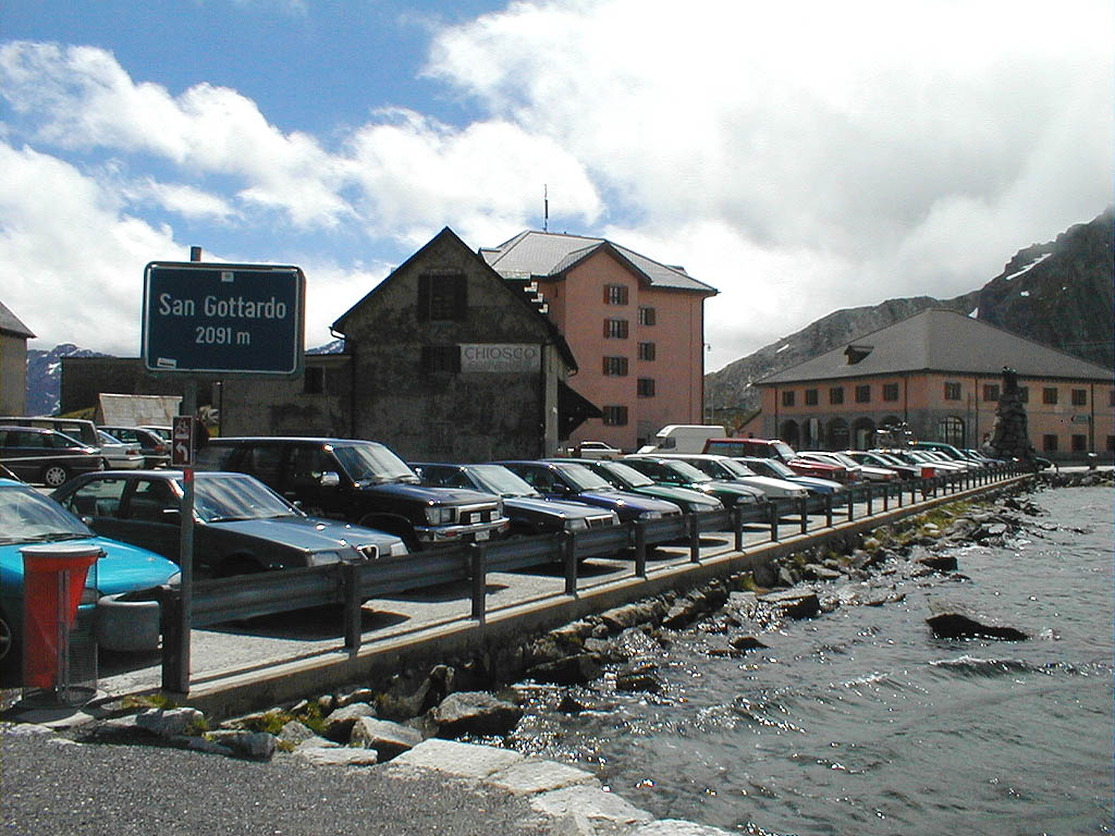 Rechts ist der zentrale bereich der Passhöhe zu sehen, gut am Adler-Denkmal (ganz rechst) zu erkennen. Zwischen den beiden hellen Gebäuden, dem Hospitz auf der linken und dem Museum auf der rechten Seite, geht es auf die hochinteressante Tremolastraße, die nach Süden führt.