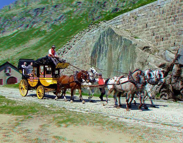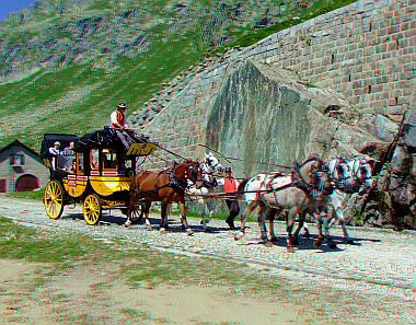 Die alte Postkutsche befördert Gutbetuchte über den ganzen Gotthardpass, von Tal zu Tal. Dieses Bild wurde im obersten Teil der Südrampe aufgenommen, von der die Kutsche erst wenige hundert Meter bewältigt hatte.