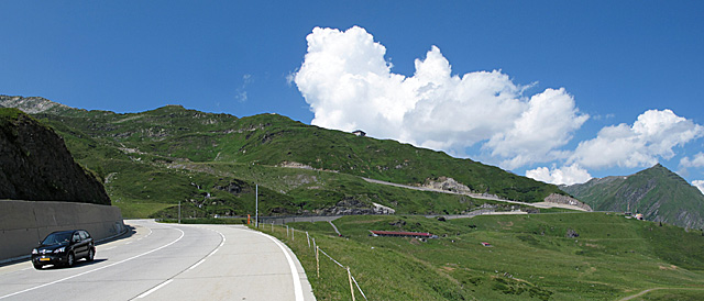 Die neue Südrampe ist breit ausgebaut, an dieser Stelle gibt es sogar für jede Fahrtrichtung noch eine Überholspur. Rechts am Bildrand ist ein kleines Cafe zu erkennen, von dessen Parkplatz und Terasse aus der Blick ins Tal, die südliche Einfahrt, und den Talort Airolo ungehindert möglich ist.
