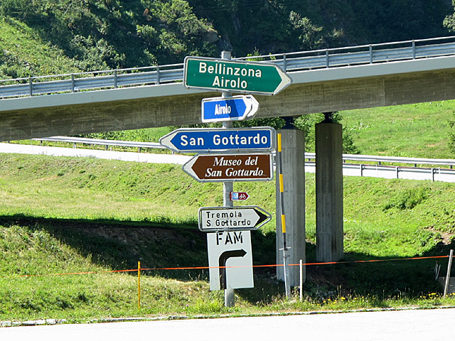 Das Schild steht an der Einfahrt zum Gotthard, oberhalb von Airolo. Biegt man links ab (blaues Schild), landet man auf der gut ausgebauten Strecke, die auf Stelzen rechts aus dem Bild führt. Folgt man dem weißen Schild mit Aufschrift Tremola/S.Gottardo, fährt man auf der Straße im Hintergrund nach links aus dem Bild heraus.