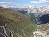 Hat man die Passhöhe erreicht, befindet man sich inmitten von Gesinnungsgenossen, überall stehen Motorräder und laufen belederte Menschen herum. Der obere Teil der Nordrampe ist von der Passhöhe wirklich phantastisch einzusehen und allemale einen Blick Wert.