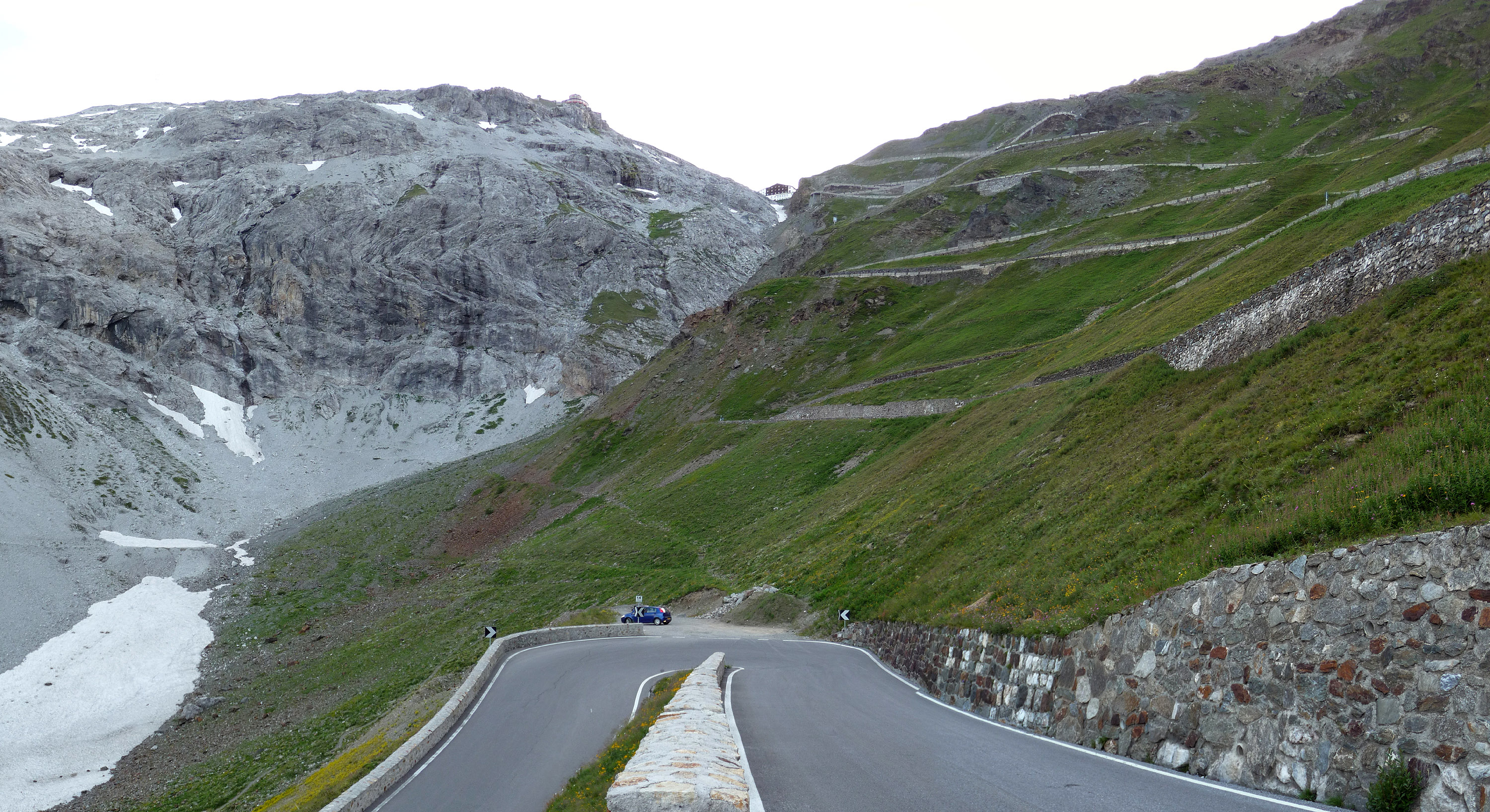 Anblick der letzten ca. 10 Kehren auf der Nordseite, oben in der Mitte ist ein Hotel auf der Passhöhe zu erkennen.
