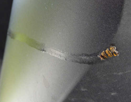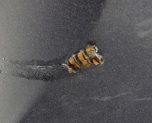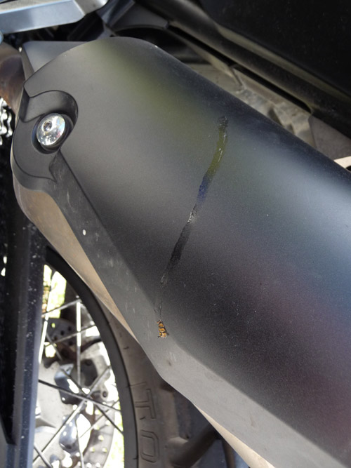 Das geschieht dem Viech recht, wie oft machte es auf meiner Urlaubsreise POCK, und mein morgentlich frisch geputztes Visier war so versaut, das ich mit dem Helm auf 11 Uhr gerichtet durch die Landschaft fahren musste. An der Auspuff-Abdeckung ist es gut aufgehoben. Hätte es nicht irgendwann geregnet, würde es dort wohl noch immer verweilen.