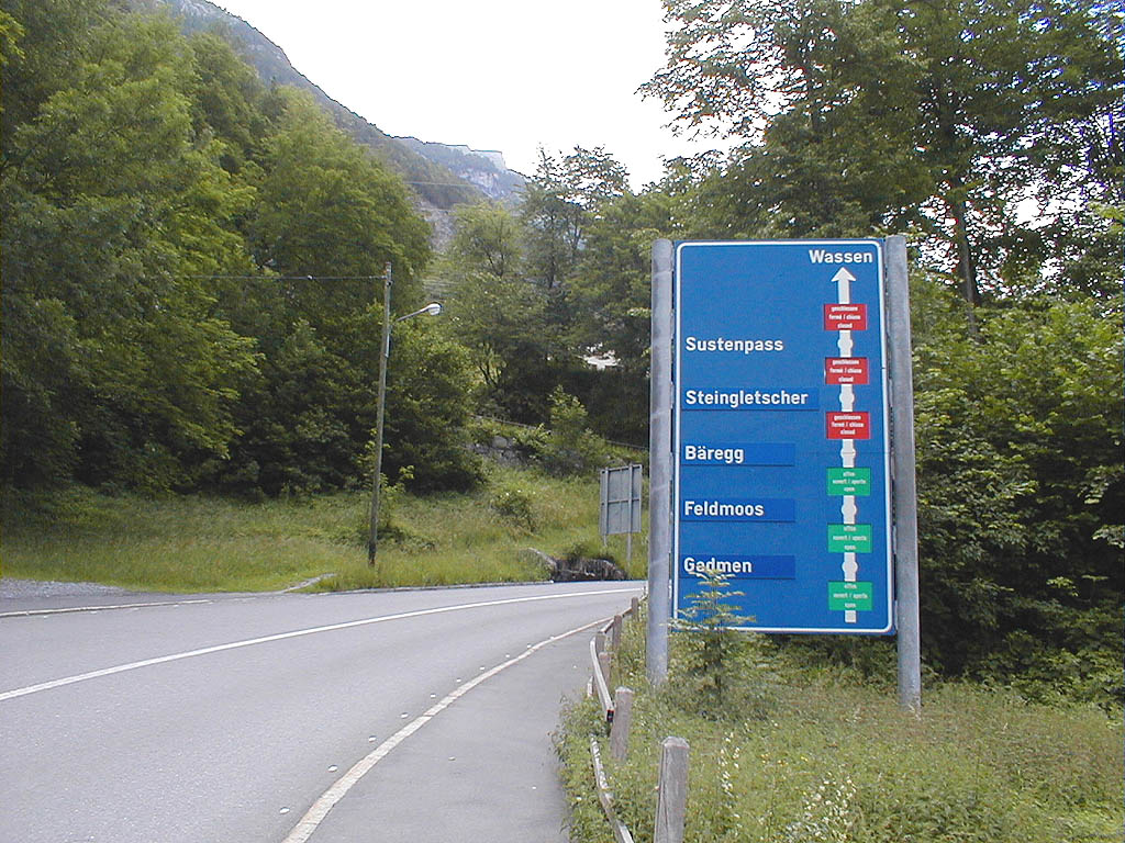 Im Jahr 1999 war bei nichtmal der Hälfte der Strecke Schluss, der Susten war wegen schlechter Wetterbedingungen gesperrt. Das Schild empfing uns schon kurz hinter Innertkirchen, dem Talort der Westrampe.