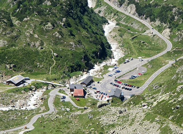 Blick hinunter auf das Hotel Restaurant Steingletscher, das sich auf der Mitte der Westrampe befindet.