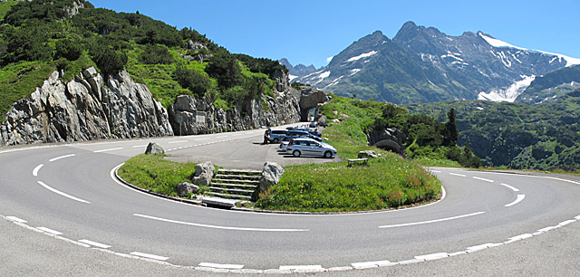 Eine der schönen Kehren im mittleren/oberen Teil der Susten-Westrampe. Vom Parkplatz aus kann man die Aussicht gut genießen, zudem gibt es am Rand der Kehren einen schmalen Parkstreifen. Von diesem kann ebenfalls ein Blick ins Tal gewagt werden.