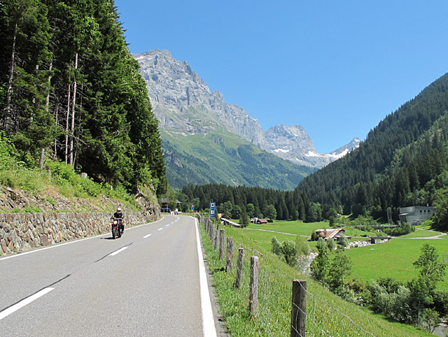 Von dem Talort Innertkirchen geht es auf der Westrampe als Erstes durch das Gadmental. Gletscher und hohe Berge können im Hintergrund bereits gesehen werden, aber noch ist die Straßenführung eher geradlinig.