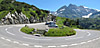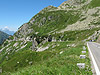 Die ist ahnlich schön wie die Westrampe, nur das es weit weniger der süßen kleinen Tunnel gibt. Dennoch, wie im Bild zu sehen, Kurven und Kehren satt, wenigstens im oberen Drittel. Die Landschaft ist fast bis hinunter ins Tal kaum bewachsen, grün bewachsene Hänge dominieren. Rund 2 Kilometer unterhalb der Passhöhe gibt es noch ein Restaurant am Straßenrand. Das scheint mehr auf Biker getrimmt zu sein, schon alleine der kleine Parkstreifen und das Bike in der Felswand sieht sehr danach aus.