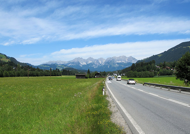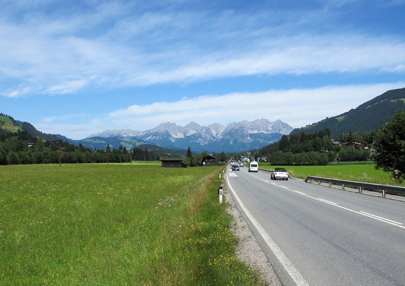 Das Bild zeigt das Kaisergebirge, das auf der Nordrampe lange Zeit gesehen werden kann. An dem Punkt ist man noch rund einen Kilometer von den Verkehrswirren des Talortes Kitzbühel entfernt.