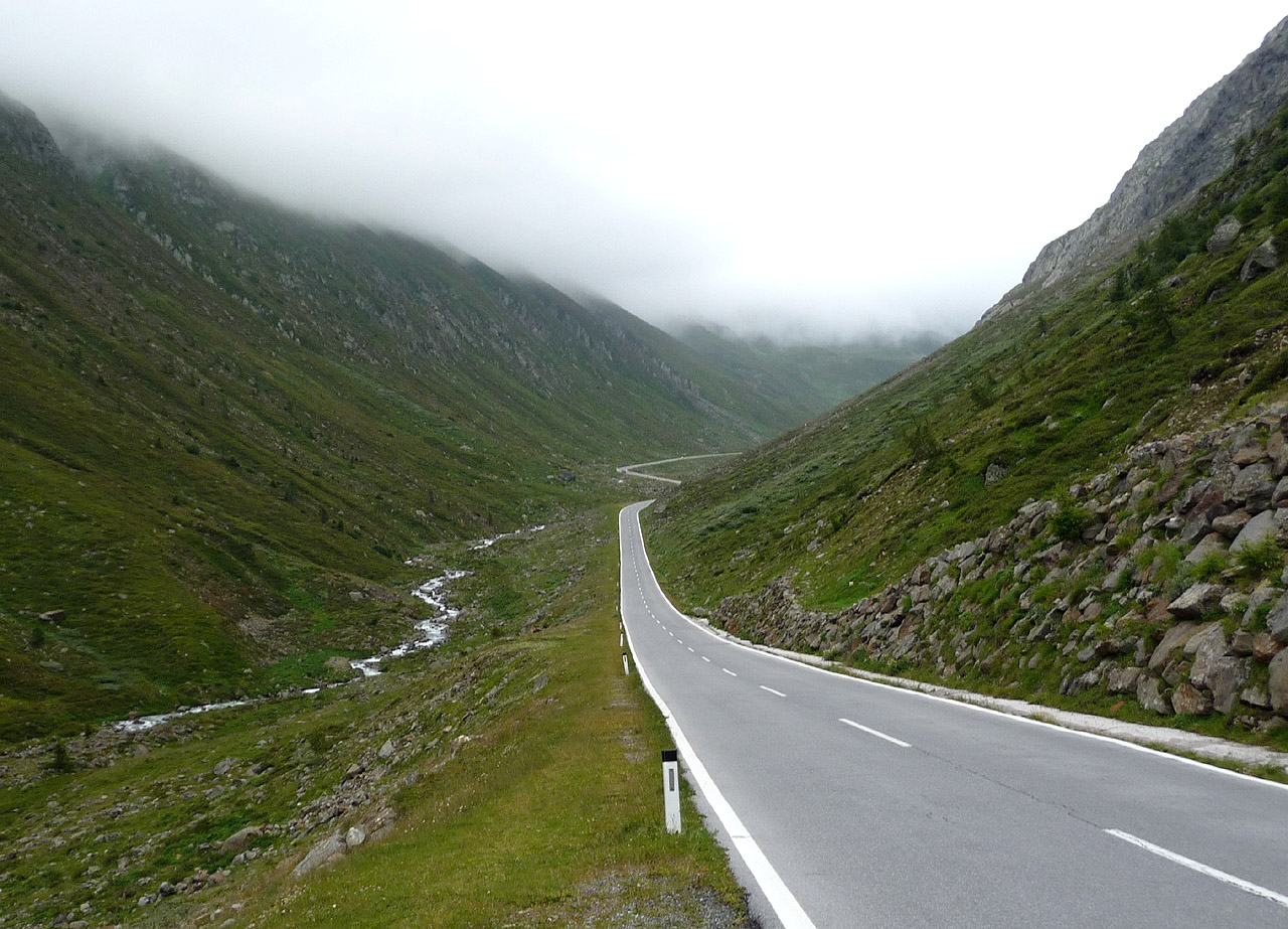 Hinter einem waldigen Abschnitt kommen ein paar längere Geraden in kahlem Gebiet, bevor ganz oben mehrere Kehren zu durchfahren sind. Hinten im Bild sind die ersten auch schon zu sehen. Der Blick geht bergauf Richtung Passhöhe, die Mautstation liegt in diesem Fall bereits hinter einem.