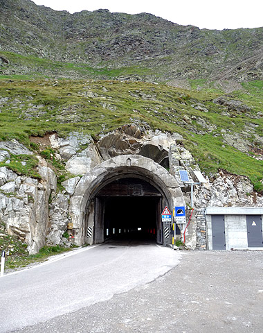 Die südliche Einfahrt des langen Tunnels auf der Timmelsjoch-Südrampe. Links geht es zu den ersten Kehren, rechts ist eine kleine Haltebuch von der aus man die Aussicht genießen kann.