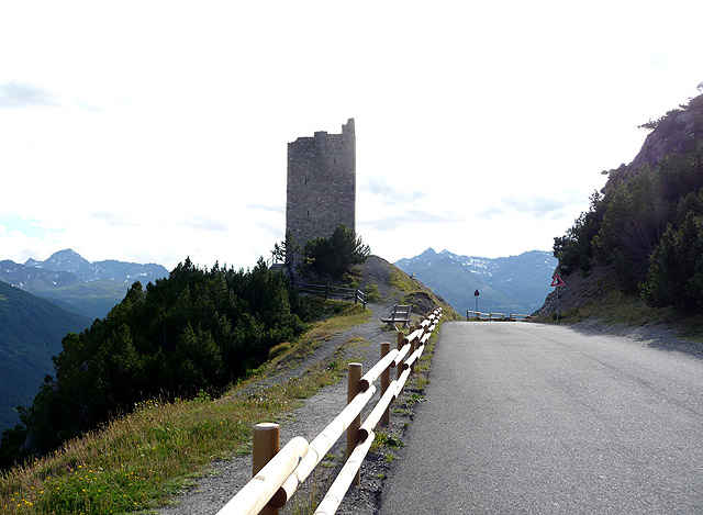 Eine der beiden Burgen auf der Passhöhe, die andere befindet sich links außerhalb des Bildes.
