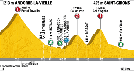 Saint Girons. Somit gibt es drei hohe Berge zu erklimmen, eventuell versuchen einige am Agnes zu entkommen, und sich in einer halsbrecherichen Abfahrt den Tagessieg zu erkämpfen.