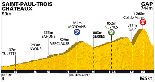 Saint Paul Trois Chateaux. Bis kurz vor dem Ziel geht es fast durchgehend bergauf, der höchste Punkt wird 10 Kilometer vor dem Ende der Etappe erreicht, wenn die Radler den 1.268 Meter hohen