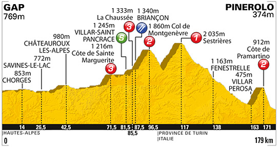 Sestriere als höchste Erhebungen zu passieren. Es geht zwar schon gut auf und ab, ist hinsichtlich der kommenden Etappen aber nicht weniger als eine ruhige Einfahrrunde.