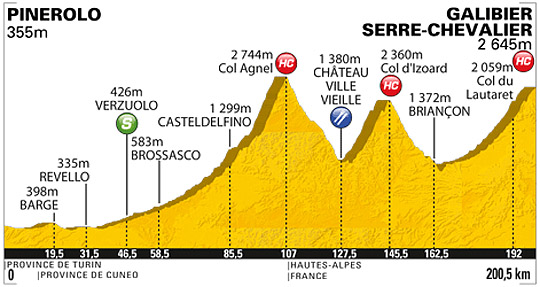Pinerolo beginnt die Etappe, führt von da an nach oben, nach oben, und noch weiter nach oben, bis nach 107 Kilometern schließlich der 2.744 Meter hohe