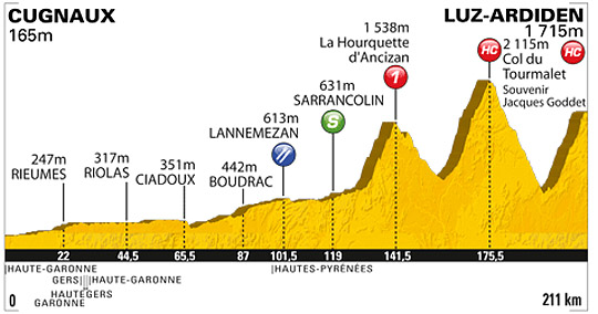Col du Tourmalet, dem traditionsreichsten Pass der Tour. Das Ende der Etappe findet in einer Stichstraße statt, die zum Wintersportort