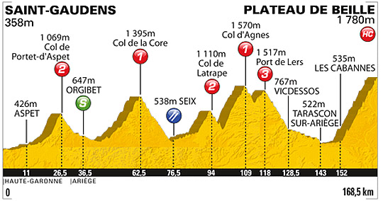Pyrenäen warten, und das nicht zu knapp. Die ersten beiden Etappen (Dienstag und Mittwoch) führen Richtung Pyrenäen, die letzte Etappe am Sonntag aus ihnen heraus. Beide haben keine Steigungen zu bieten und sollen hier auch nicht groß erwähnt werden. Die dazwischenliegenden 3 Tage werden aber richtig nett.
