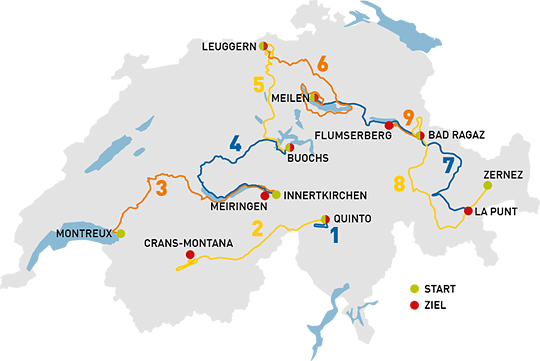 Tour de Suisse. Von Samstag den 8. Juni bis Sonntag den 16. Juni geht es auf 9 Etappen quer durchs Alpenländle.