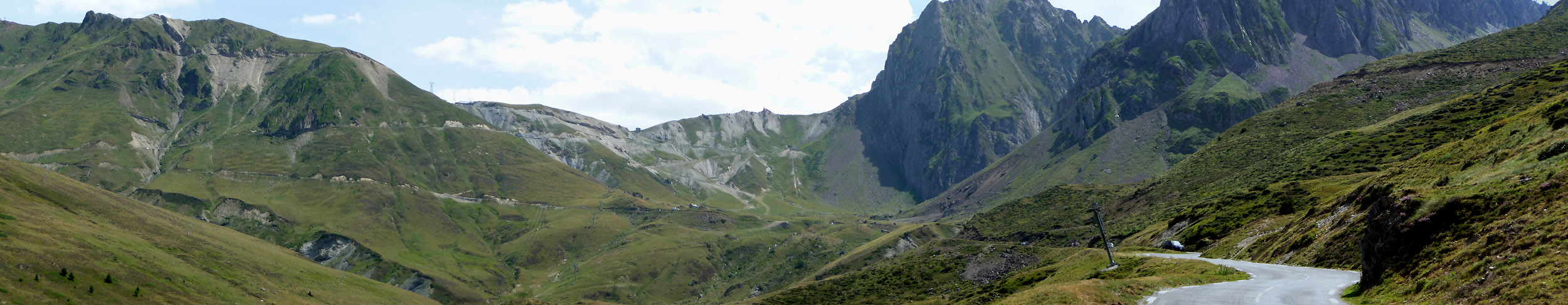 Kleines Panorama, das einen Teil des oberen Bereichs der Tourmalet-Westrampe zeigt. In der Mitte ist der Einschnitt der Passhöhe zu erkennen, links befindet sich ein Teil der sehr schroffen Zielgerade.