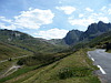 Die Ostrampe kommt nicht ganz so schroff und steil daher, die Straße führt auf weiten runden Kehren und Kurven durch die offene Graslandschaft. Das Bild wurde wenige hundert Meter hinter der Passhöhe aufgenommen.