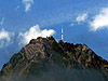 Hin und wieder hat man dort freie Sicht auf das Observatorium, das sich auf der Spitze des Pic du Midi de Bigorre befindet. Achtet man darauf, macht es sich an manchen Stellen durch die Baumreihen bemerkbar. Ich hatte wegen der schattig gelegenen Straße und den Wolkenfetzen am Himmel sehr fotografier-ungünstige Bedingungen, daher ist das Bild nicht besonders toll geworden.