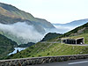 Hinter La Mongie wird die Passfahrt dann langsam etwas gewöhnlicher. Der Weg nimmt eine normale Breite von 2 Fahrspuren an und durchquert unter anderem ein paar Galerien, die an einem kleinen Stausee vorbeiführen. Dahinter geht es auf teilweise recht abgefahrener Piste durch waldiges Gebiet.