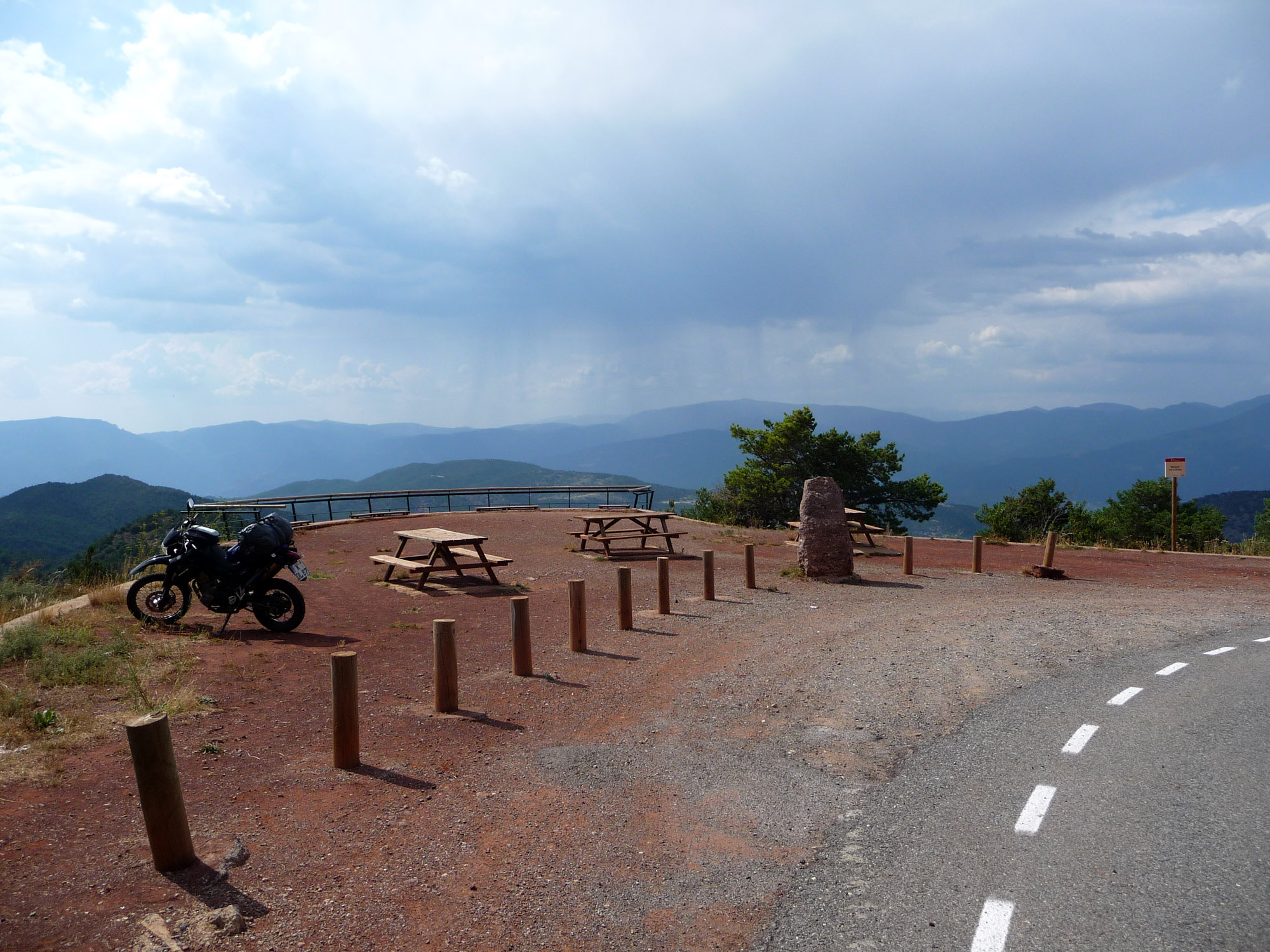Blick von oben auf den Aussichtspunkt auf der Nordrampe des Trava. Richtung Tal geht es nach rechts, die Passhöhe liegt wenige Fahrminuten im Rücken des Betrachters.