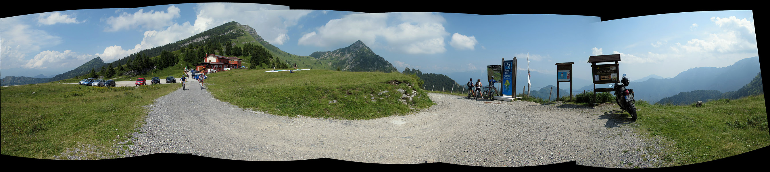 Rechts geht es auf die Ostrampe des Passo della Cocca, links ist das Rifugio der Tremalzo(i)-Passhöhe zu sehen. Die asphaltierte Nordrampe des Tremalzo läuft links aus dem Bild heraus, die Südrampe verschwindet in dem auffallend spitzen Berg, der sich nur wenige Pixel links der Bildmitte befindet.