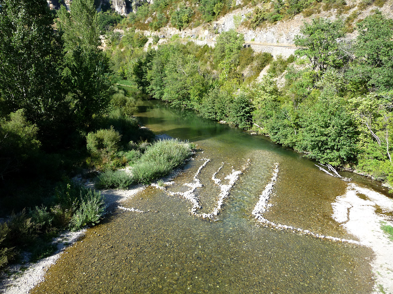 Direkt an der Einfahrt auf die D145 liegt eine kleine Brücke, die den Fluß Dourbie überquert. Scheinbar sind dort ein paar Kinners mit Staudammbauen beschäftigt gewesen, einem Hobby, dem ich in jungen Jahren auch gerne nachgegangen bin. Von dieser Stelle wurde der Ort Cantobre aufgenommen.